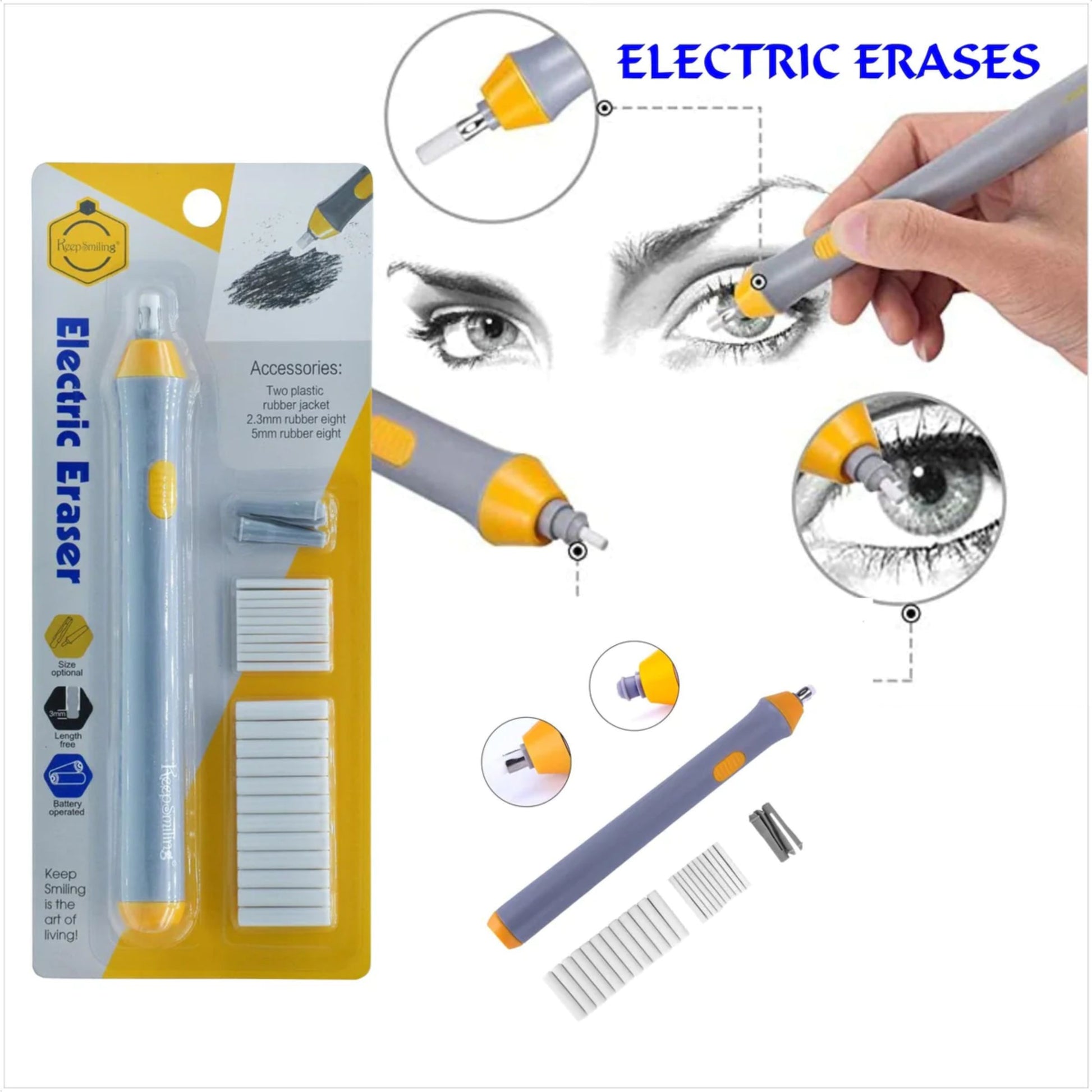 Keep Smiling Electric Eraser — erase with precision and ease! Comes with 22 refill erasers, ideal for school, office, and art projects. Smooth, accurate, and effortless to use.